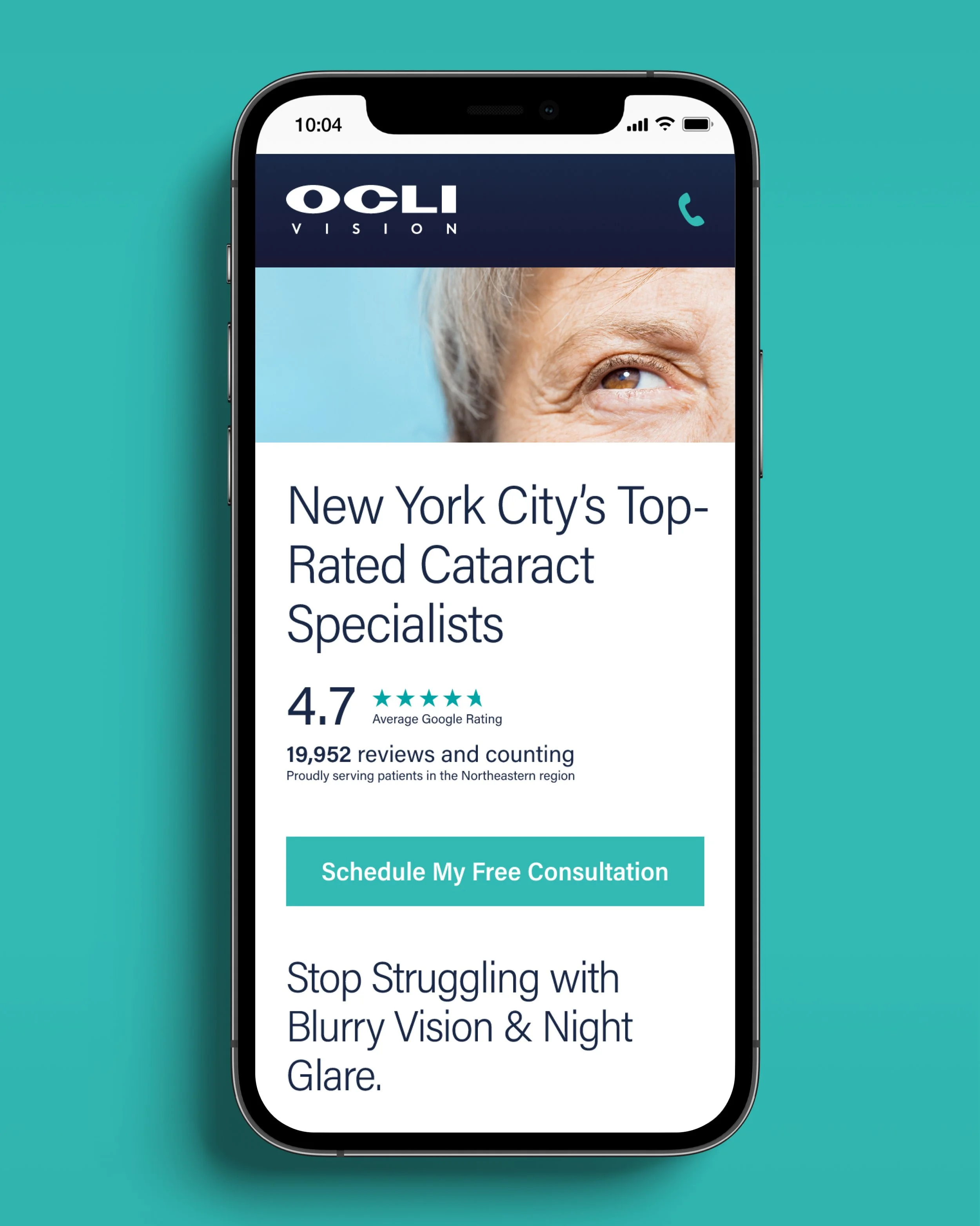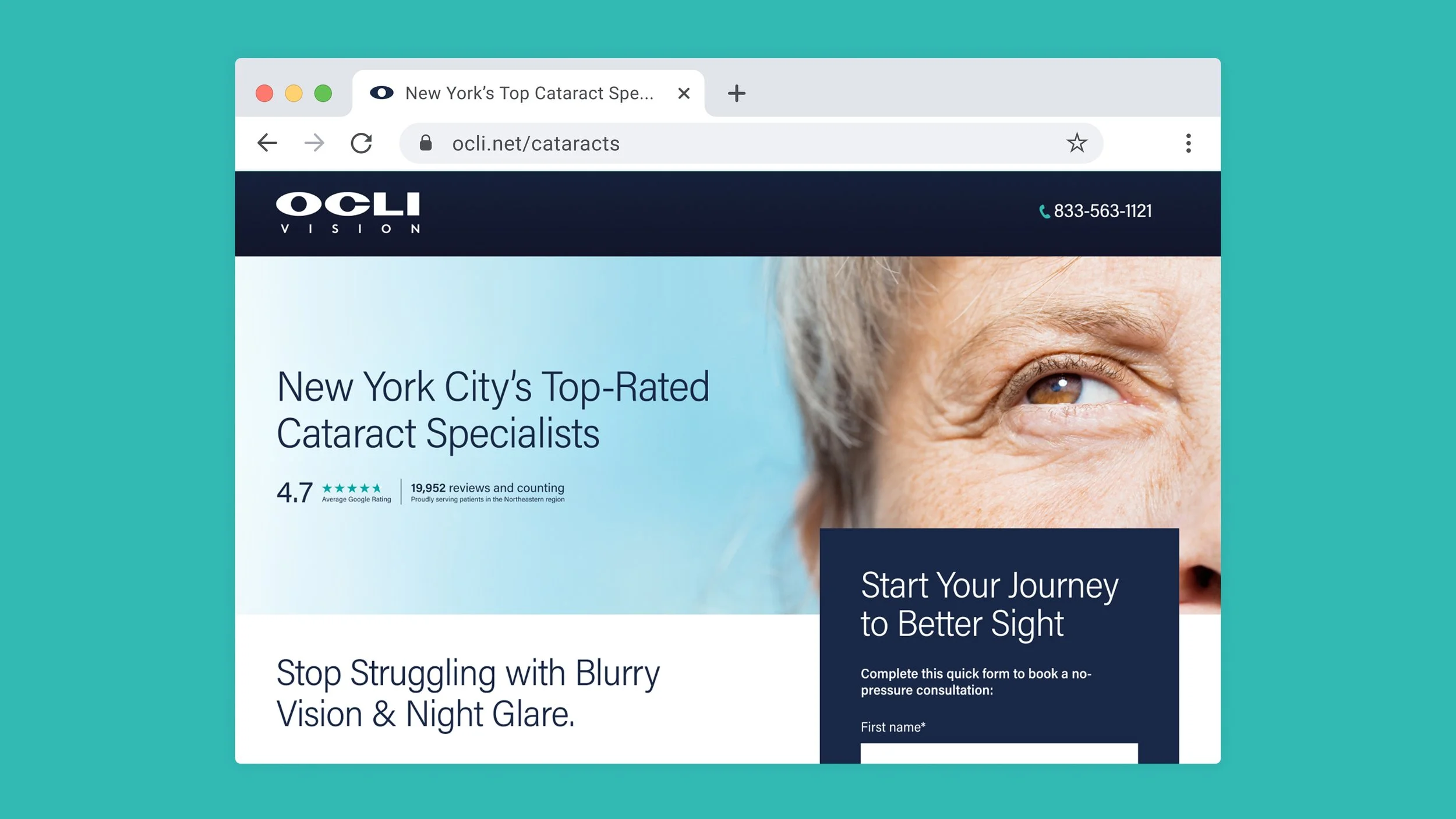OCLI Vision is already known as one of the country’s leading eye care groups (4.7 rating, 20K Google reviews). Their physicians consistently rank at the top of Castle Connolly’s ‘Top Doctors’ list. Awareness wasn’t much of an issue; it was getting visitors to take action on pretty serious issue related to them not being able to see. Plus, this demo skews older, so a big point was modeling the page to communicate a complex issue, simply.